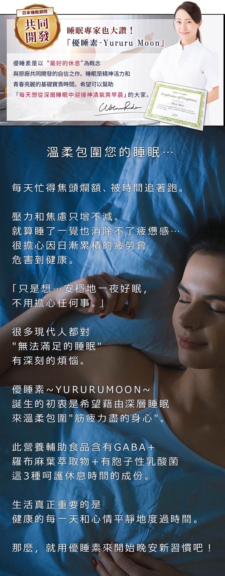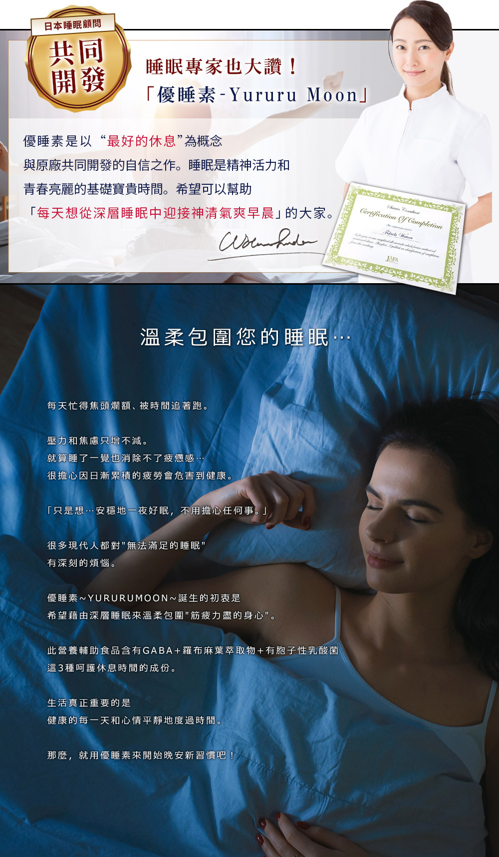 - 優睡素~YURURUMOON~是營養輔助食品,所以不用擔心會有副作用等等的不好影響。若有任何顧慮的地方,建議先給醫師看過成份後再決定是否要使用。