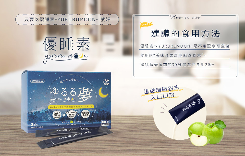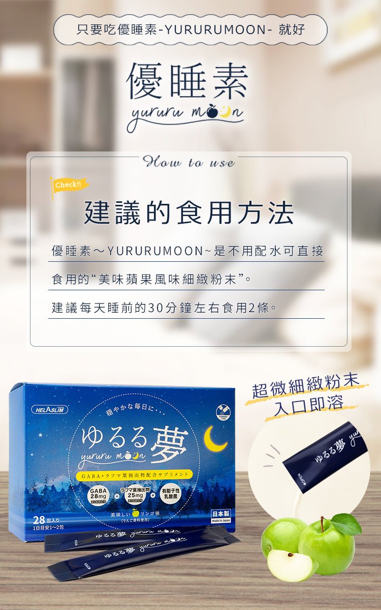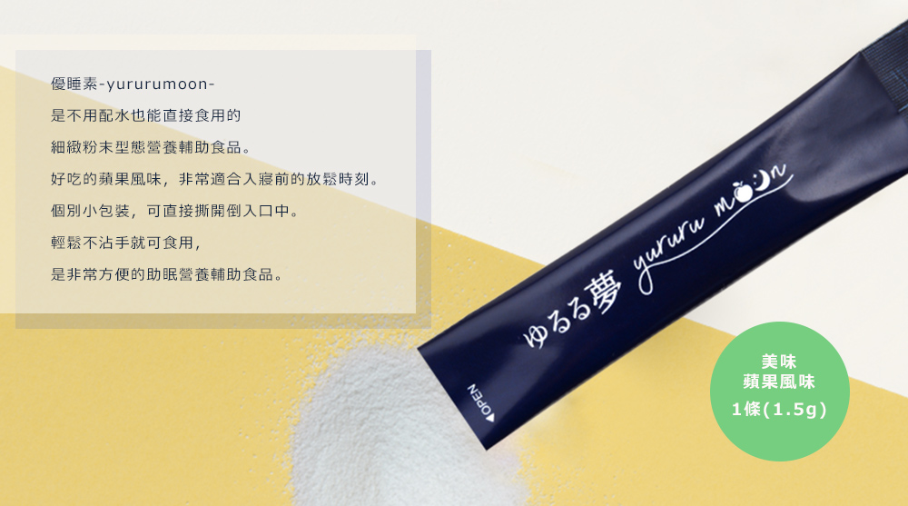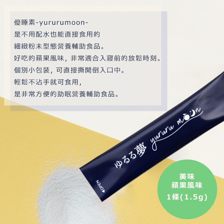 - 優睡素~YURURUMOON~是不用配水可直接食用的“美味蘋果風味細緻粉末”。