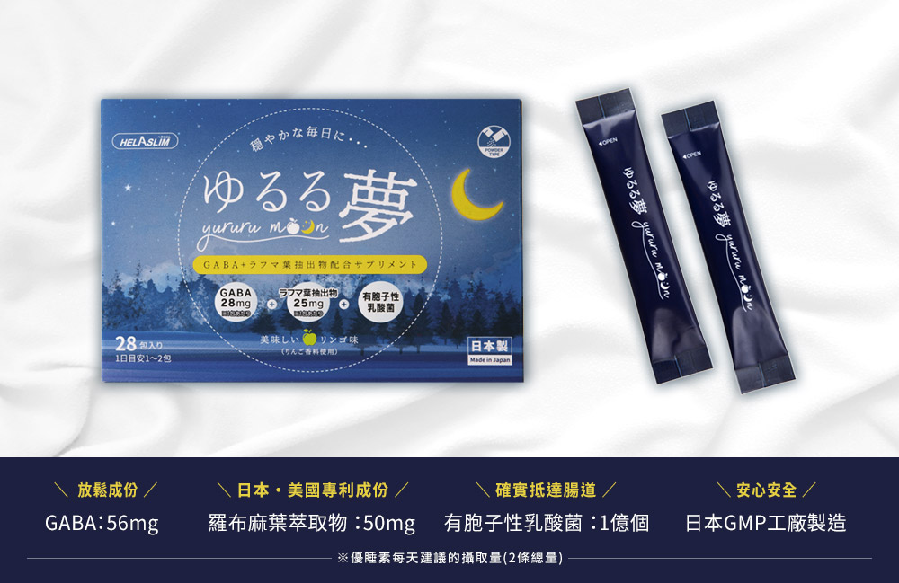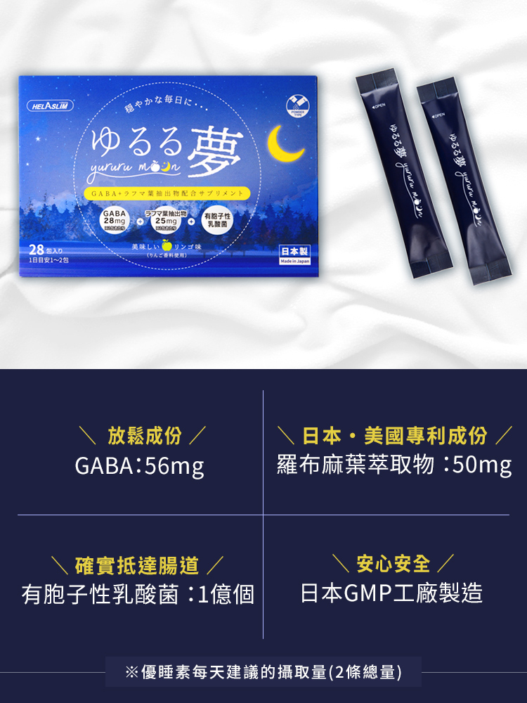 - 建議每天食用2條。食用優睡素~YURURUMOON~2條的話,即能補充到建議攝取量GABA56mg・羅布麻葉萃取物50mg・有胞子性乳酸菌1億個。